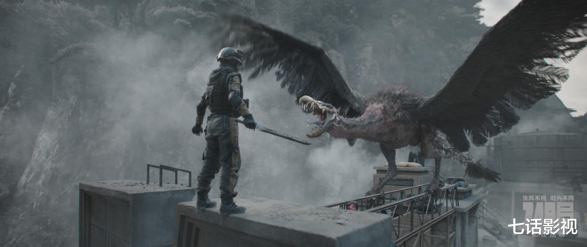 另一边,郑恺饰演的局长,一个纯管理型人员,开着战斗机上来直接就能把怪物鸟突突死,然后弹药用尽,局长也壮烈牺牲,临死前贡献大段煽情演讲。