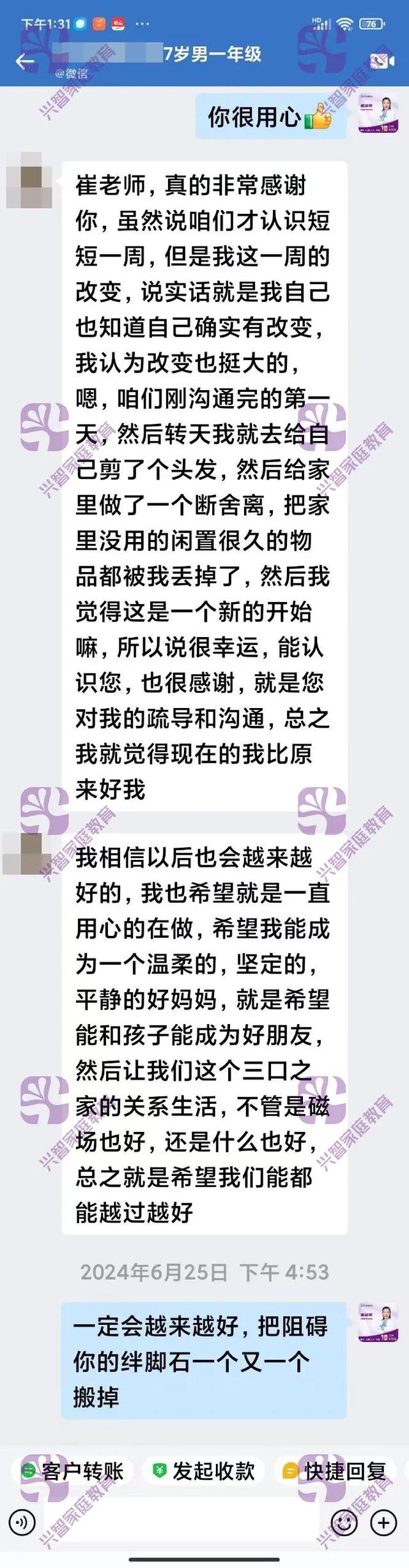 “这个学员让我深刻感受到,作为一名家庭教育指导师,我们的工作不仅仅是指导家长如何教育孩子,更是帮助他们找到内心的平静和力量。”崔彦荣老师说,“当看到学员和她的女儿重新找回生活的希望时,我感到无比的欣慰和自豪。”