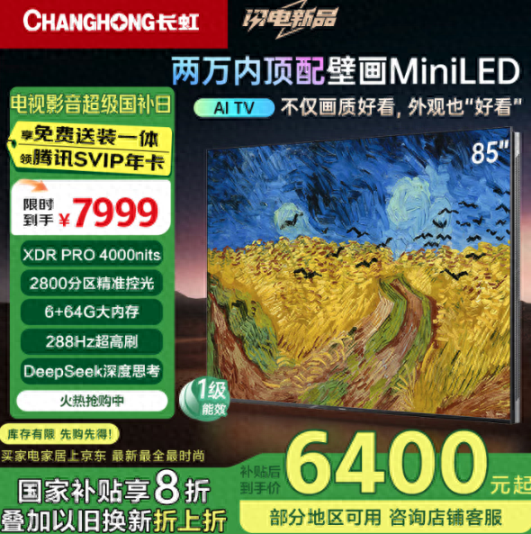 两万内顶配壁画电视,长虹85U7HMiniLED到手价仅6400元