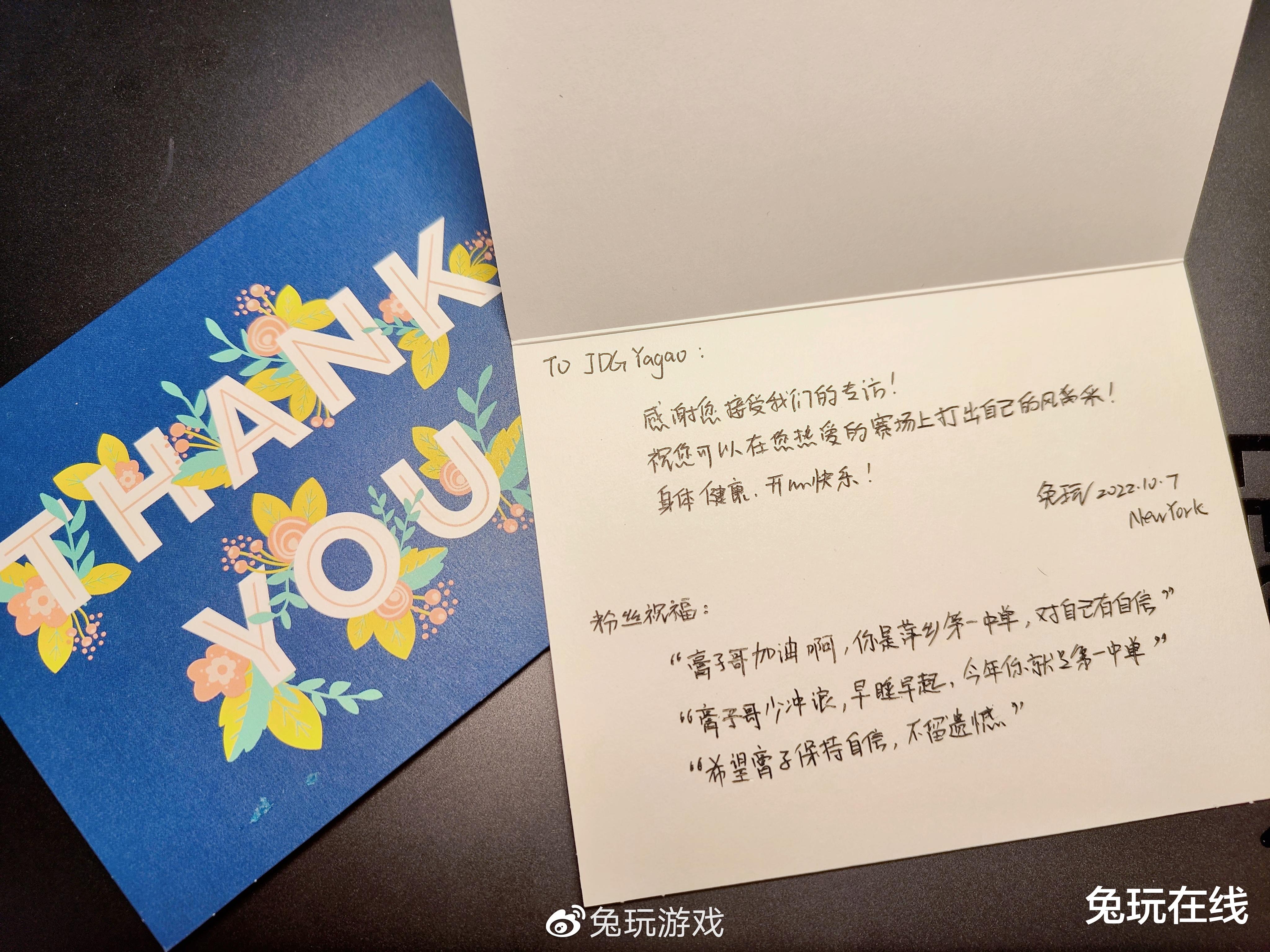 在本次专访前的征集博(https://weibo.com/5042958097/M9foEbMbY?from=page_1005055042958097_profile&wvr=6&mod=weibotime)中,收集了几条对Yagao选手的祝福,在专访时写在了明信片中交予选手本人进行鼓励加油,感谢积极参与的粉丝以及大家对兔玩的信任!