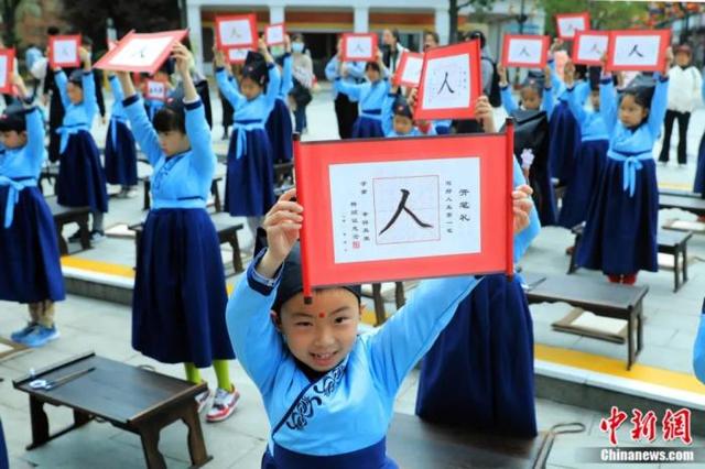 ▲小朋友身穿汉服在上海参加“国学开笔礼”活动,展示各自写的“人”字。作为中国传统文化中少儿开始识字习礼的一种启蒙教育形式,近年来,“开笔礼”等仪式收到热捧。汤彦俊 摄