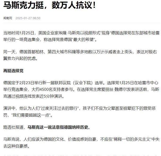 说到选择党,他们的支持率是排第二的,紧跟基民党。可德国的其他政党基本上是不会跟选择党搭伴的。再加上这次默茨的合作事件,德国老百姓对极右翼党派的反感可见一斑,魏德尔当上总理的机会简直可以说是渺茫得很。德国最近街头涌现数十万抗议者,大家对此极右翼政党的愤怒真是实打实的,魏德尔想当总理,这几乎就是个梦。马斯克的支持下也有数万人走上街头,气氛相当热烈。再说说,联邦议院刚把一项收紧移民政策的提案否了,这也反映了民众对保守派基民盟向极右翼靠拢的强烈不满,基民盟干脆表明永不与极右翼合作。眼下,德国的竞选气氛也在升温,三大党都确定了他们的总理候选人。默克尔最近还罕见地对继承者与选择党的“合流”表示了批评,真是让人意外。