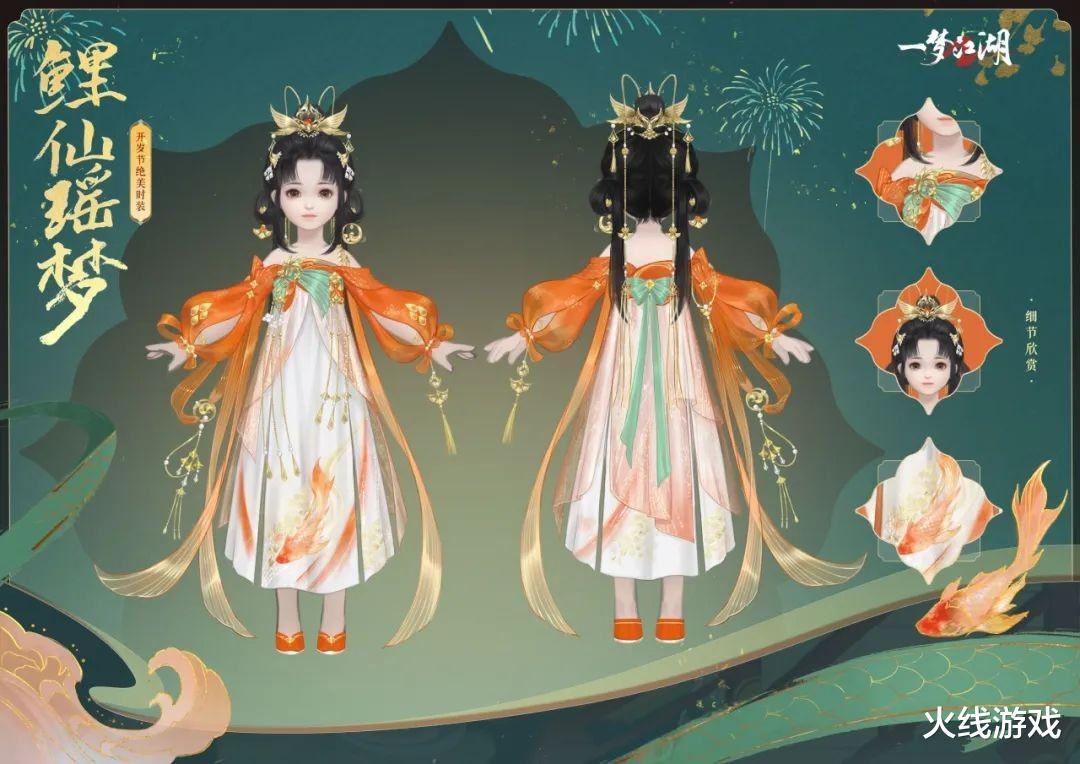 正所谓年年有“余”,过年怎么能少了鱼呢,自带锦鲤元素的【时装·鲤仙瑶梦】应邀而来。整件衣服色取锦鳞闪烁的金色与鳍翼摇曳的红色,新的一年穿上直接红红火火,这事“橙”了,日子过得“红”火,这好兆头配上自我脑补的锦鲤buff,吉祥喜庆之福直接身上挂,这一下谁还分得清我和锦鲤谁是谁啊。先前的“锦鲤抽奖”打响了年年有鱼的第一炮,如果中了,那我就是锦鲤本鱼,不穿锦鲤衣服都说不过去。如果没有中,那不得更要穿了,不是锦鲤那我穿锦鲤,必须打入锦鲤内部蹭蹭欧气,这波逻辑满分。