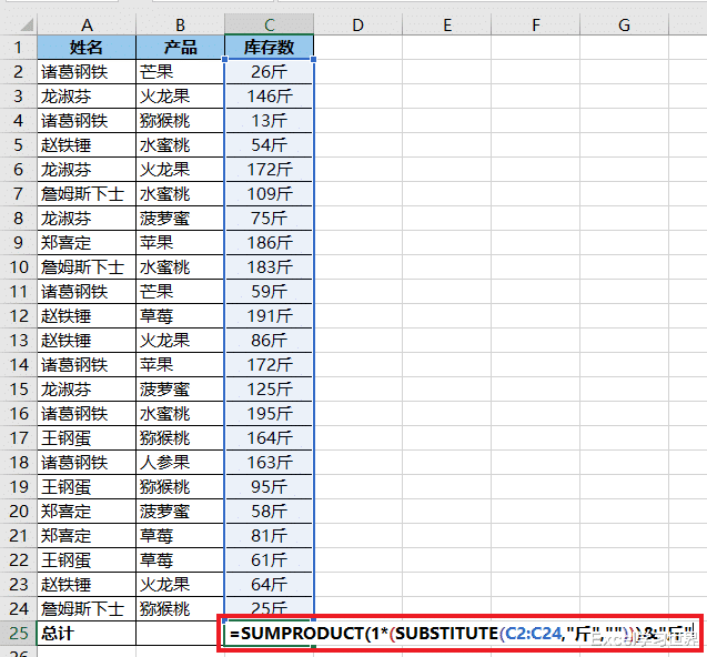 =SUMPRODUCT(--(SUBSTITUTE(C2:C24,"斤","")))