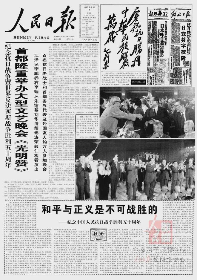 1995年9月3日纪念中国人民抗日战争胜利50周年,人民日报头版集中展示了发表在新华日报上的毛泽东同志手书“庆祝抗日胜利 中华民族解放万岁”及两报刊登的消息。