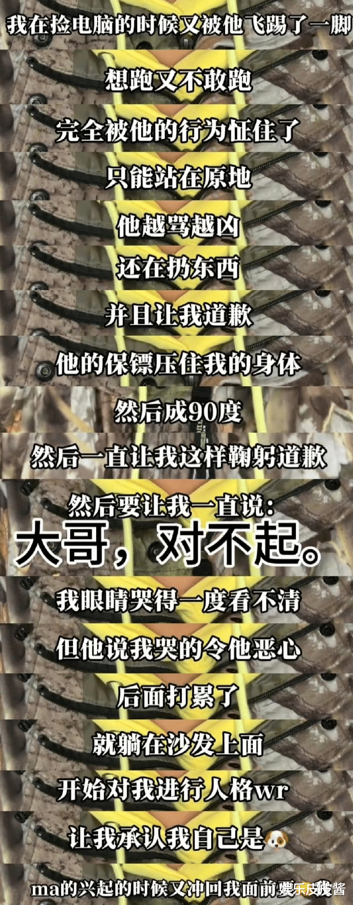 而且黄毛毛还说张大大在殴打她的时候,竟然是用过枕头和茶杯等物品,甚至还想用电脑砸她,只不过不知道什么原因制止住了,并且还在语言上进行人身攻击,然后就是让当事人黄毛毛进行道歉,说各种贬低自己的话。