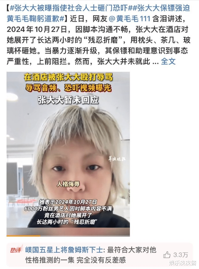 黄毛毛表示:“在2024年的10月27日,自己因为和张大大在脚本方面沟通出现了一些问题,然后就被张大大殴打摧残了长达两个多小时,不仅在身体上进行了攻击,而且在语言上也进行了攻击,重点是对她伤害完之后还不让她离开,之后又叫了一些不认识的人,对她所住的地方进行砸门骚扰恐吓等行为,导致现在她还没有从这段阴影中走出来。”