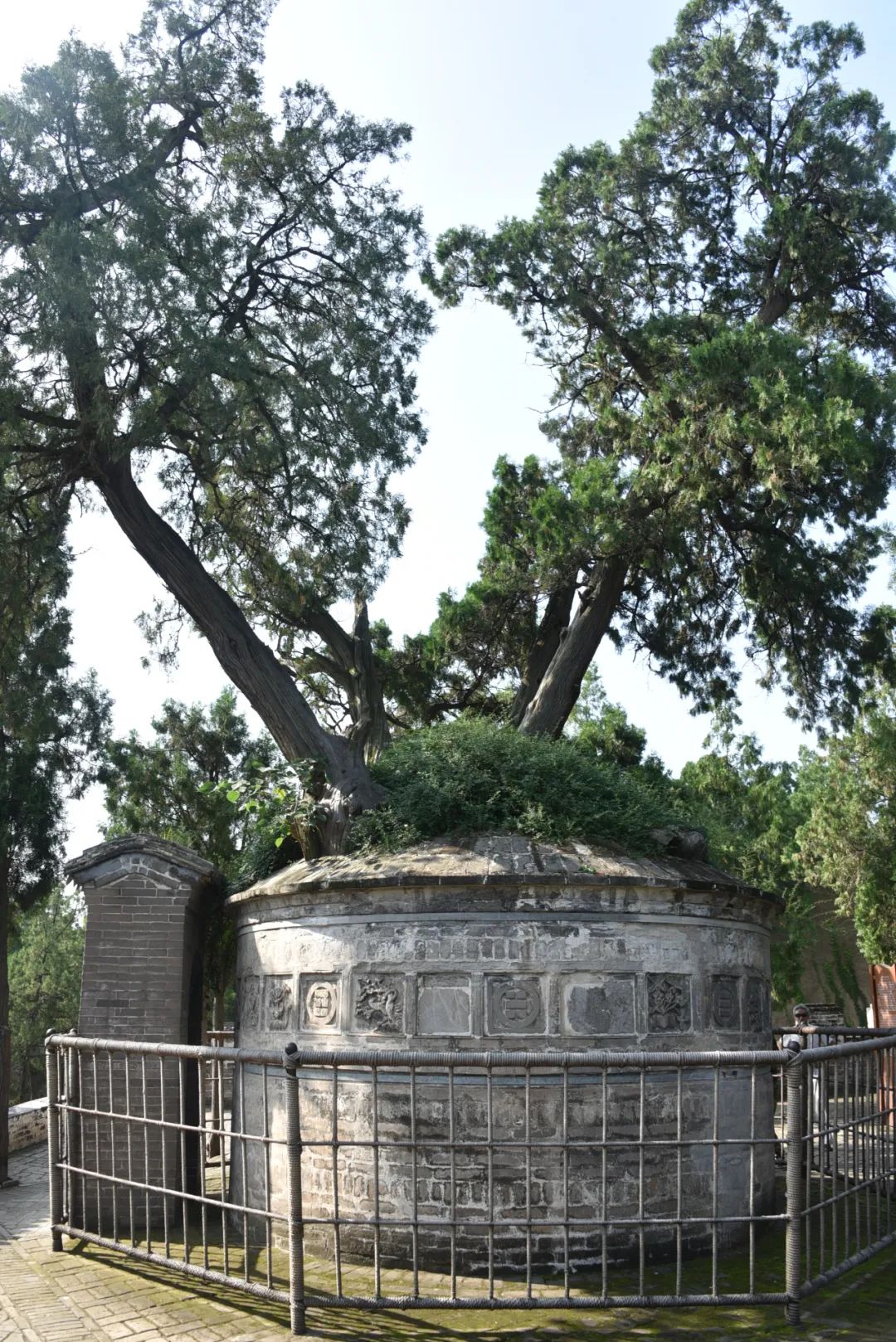 而司马迁墓就位于太史祠后面,经西晋、宋、金、元、清五次修葺。墓系砖砌,呈圆形,高2.15米,周长13.19米。墓壁周围嵌有砖雕八卦图案和花卉图案16幅,墓顶古柏一株,树分五枝,称“五子登科柏”。