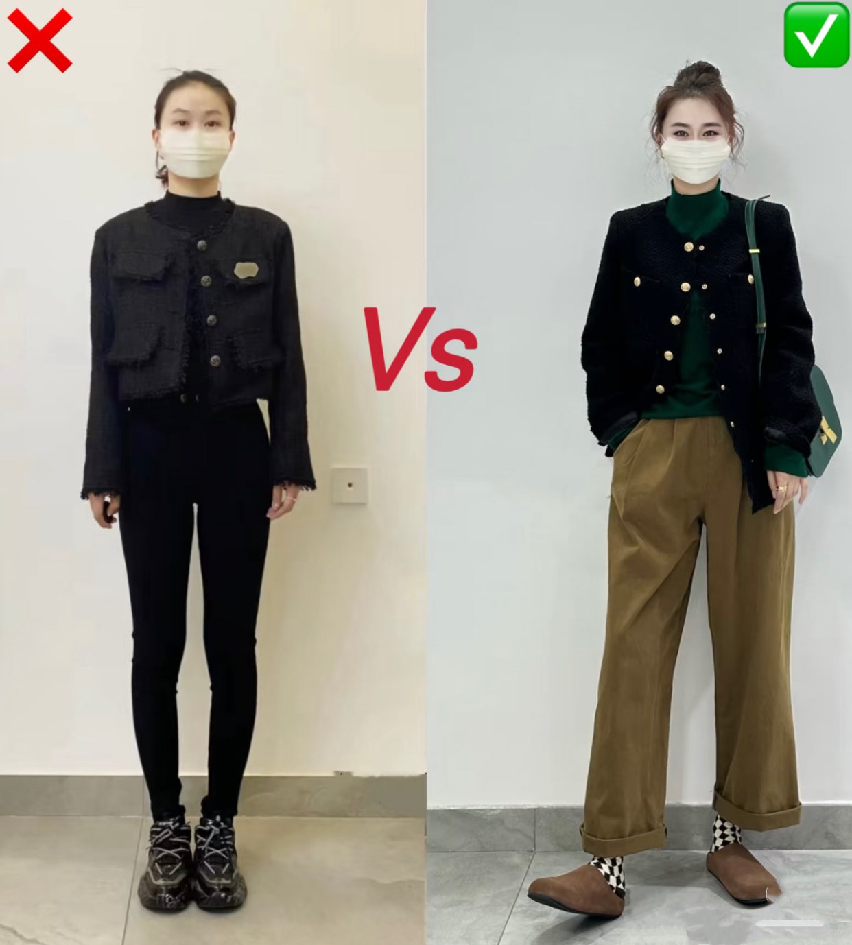 用黑色小脚裤搭配小香风外套,是很多人在生活中都会有犯的错误,以为上下同色显高显瘦,却忽略了裤型的修饰效果。对于腿型没有那么完美的女生来说,小脚裤分分钟会暴露缺点。