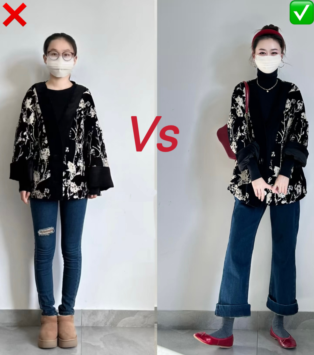 这一组的改造也是非常成功的,黑色印花的宽松针织搭配不好真得很像奶奶装!右侧把内搭换成修身的中高领层次分明,宽窄的廓形对比也能视觉显瘦。再加上一条能够修饰腿型的宽松直筒裤,完美的规避的腿型短板!