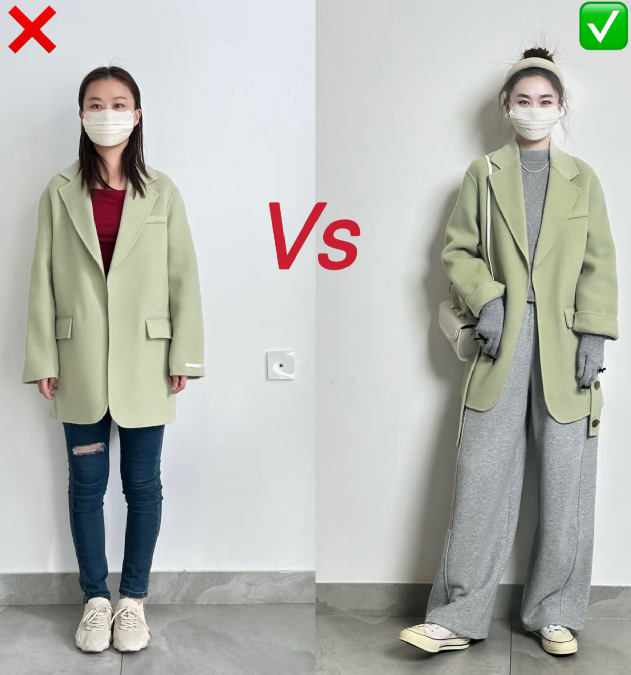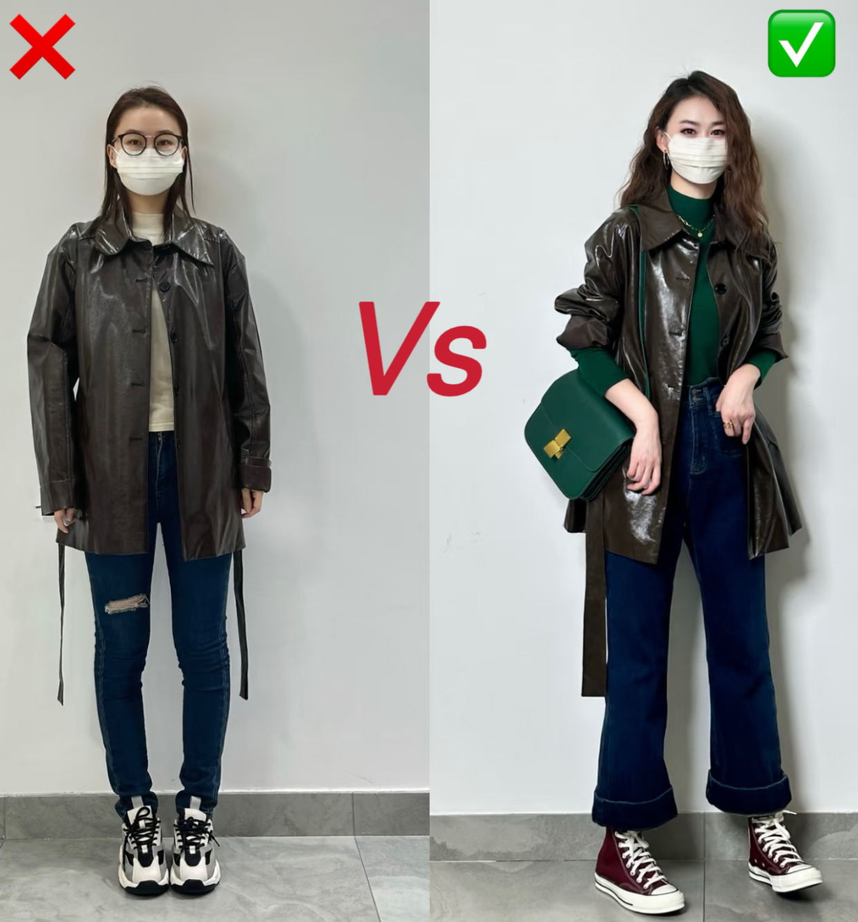 右侧换成更能够修饰腿型的直筒裤,简洁设计的球鞋更轻盈。再通过绿色的打底衫、包包与咖色外套对撞提升时尚感,穿搭博主的味道瞬间就有了。