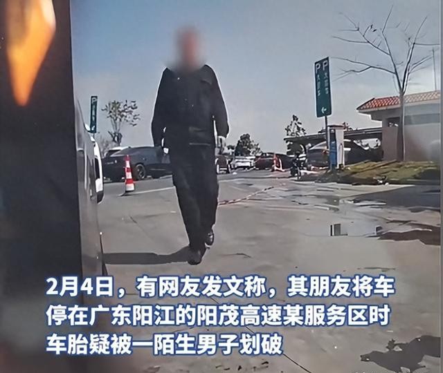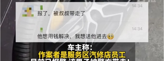犯罪嫌疑人乃服务区修理厂员工。据网友爆料,当日有三辆车停于修理厂门口,且每辆车的车胎均遭受不同程度划伤。