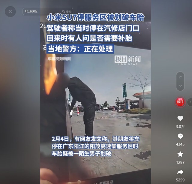 根据网友曝料,自己在2月4日的时候发现,有人趁着自己在高速服务区上厕所的空档,把自己爱车的轮胎放气。