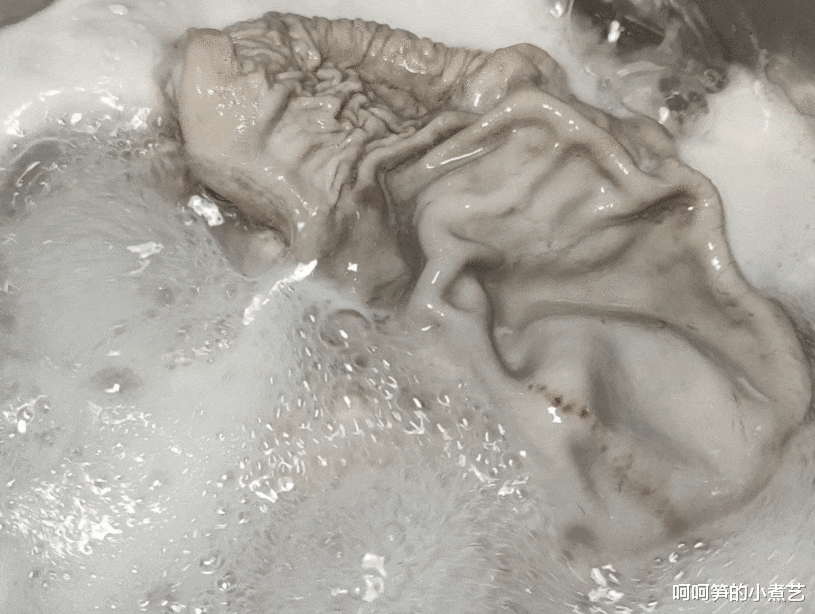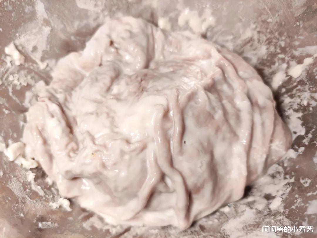 然后再倒入一些面粉进去,这次不加白醋和盐,再次用手抓一抓,还是等两三分钟,再用清水把猪肚清洗干净,这时候粘液基本已经干净了。