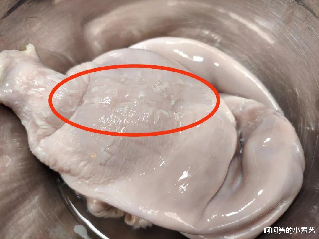 洗干净表面粘液后会看到猪肚表面有些黄色的东西,要用小刀刮掉。
