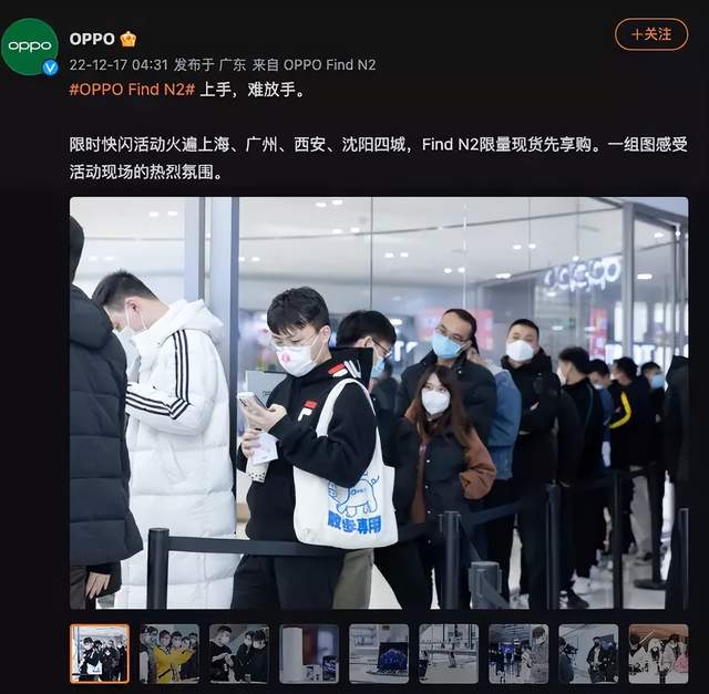 而OPPO在上海、广州、西安、沈阳四座城市举办的快闪活动现场中,很多人也对于OPPO Find N2和OPPO Find N2 Flip很是感兴趣,在各大OPPO线下店中排起了长龙,也有人当场就下单入手了,可见OPPO Find N2和OPPO Find N2 Flip两款折叠屏产品有着独特的产品吸引力。