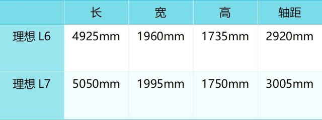 尺寸方面,理想L6长宽高4925/1950/1735mm,轴距为2920mm。理想L7的长宽高分别为5050/1995/1750mm,轴距为3005mm。