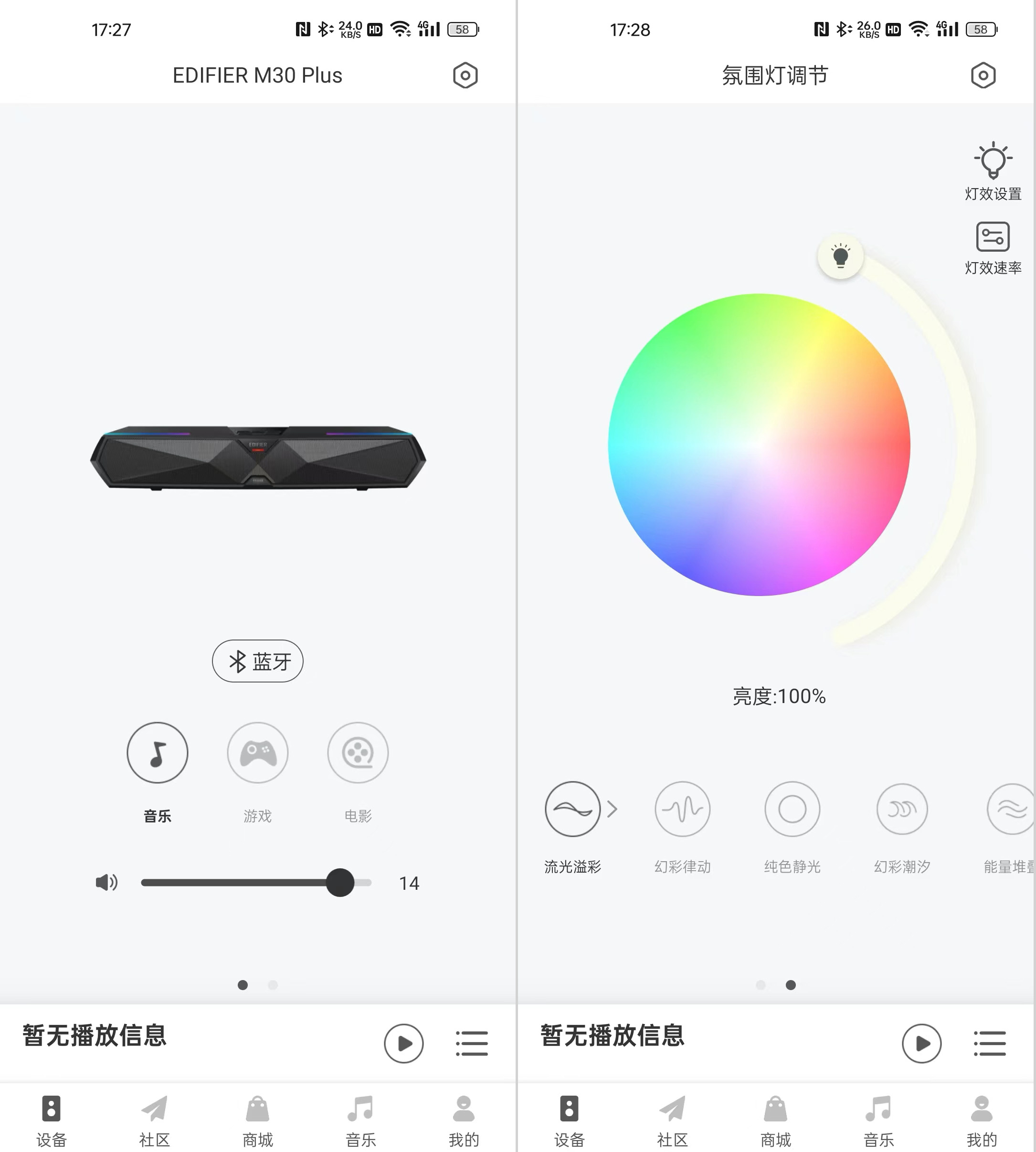 我还可以对M30 Plus的灯效进行个性化的设置。位于音箱两侧的RGB灯条支持6种不同的灯效模式,而且每一种还可以针对灯效速率、灯光颜色、亮度等进行更加精细化的设置。