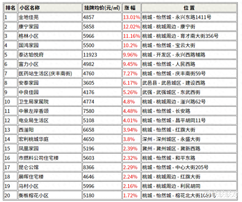 衡水二手房本月涨幅最大的小区排行1、金地佳苑:4857元/㎡,上涨+13.01%,位置:桃城 - 怡然城 - 永兴东路1411号