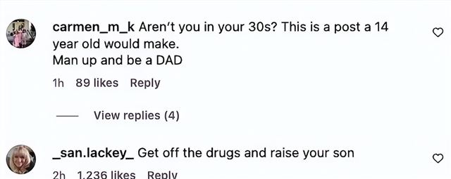 另有评论指出:“戒掉药物,照顾好你的儿子。