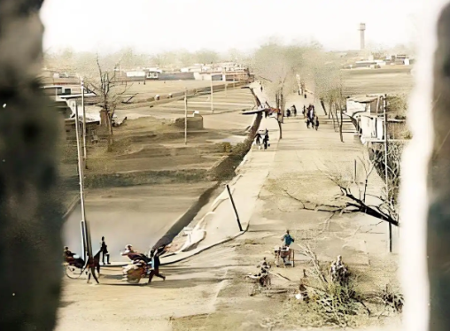 站在西城墙上,透过箭楼窗口向西眺望。城外是通往火车站的大道。道路上出现不少迎来送往的人力车。远处赫然一座高高的水塔,是为火车供水用的。