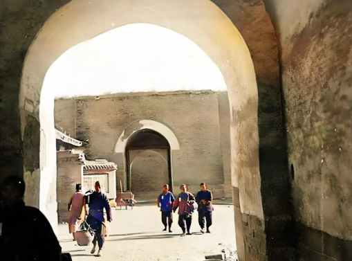 站在城门洞里看瓮城城门, 三个小脚妇人正朝城内走来,在瓮城的西侧,是一座带有八字墙的小庙宇。