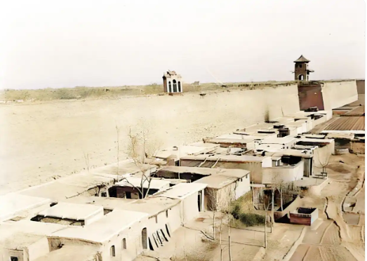南城外的民居,这一片为南关之地,是当时邢台城外最热闹的地方。远望高大的南城墙上,建有碑亭和瞭望塔。