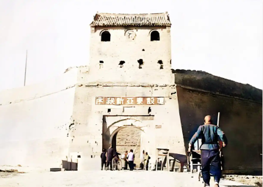 从东门城墙上向下看,城门一侧是日本人建的简易防御工事,如果遇到袭击,鬼子便会躲进半圆形的工事内抵抗。此时,一对穿着入时的母女走出城,日本士兵不怀好意地盯着她们的背影。