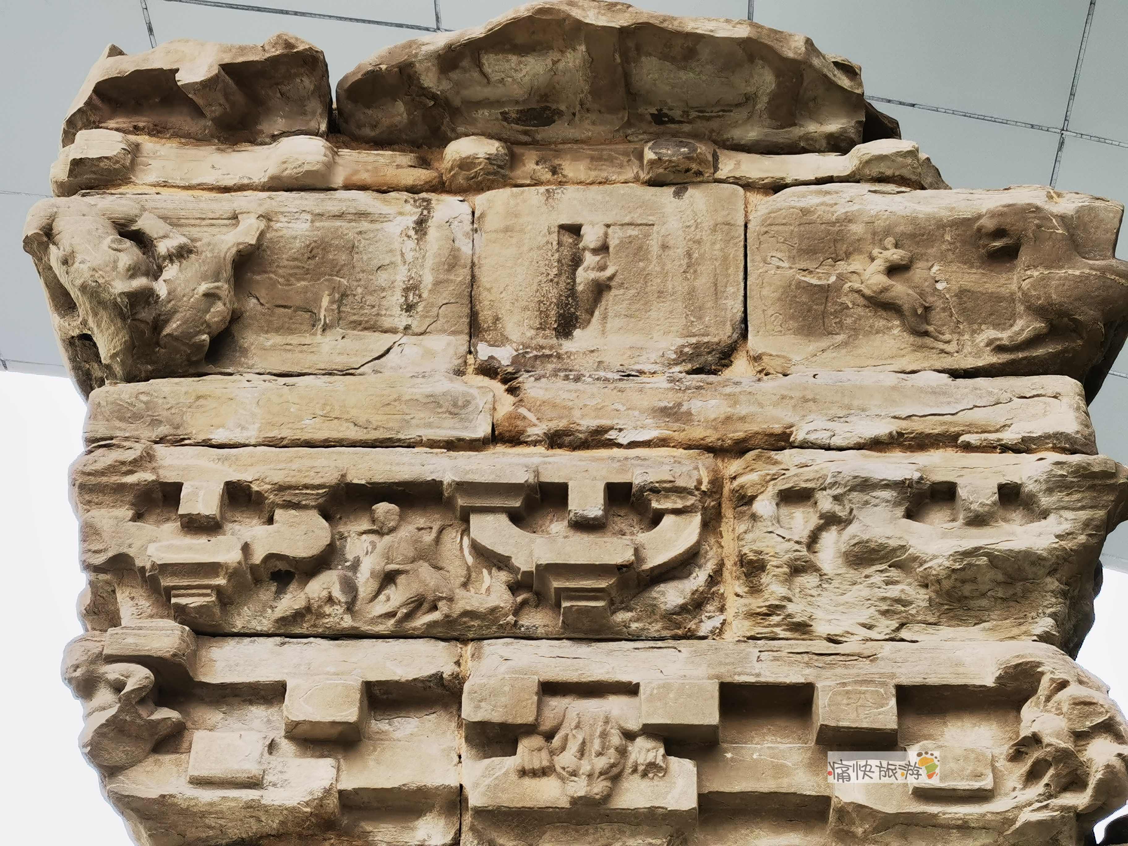 南北二阙身上部及阙檐下布满了车骑出行、童子捉鸟、二虎相斗等数十幅苍劲有力、古朴生动的汉代雕刻图案。