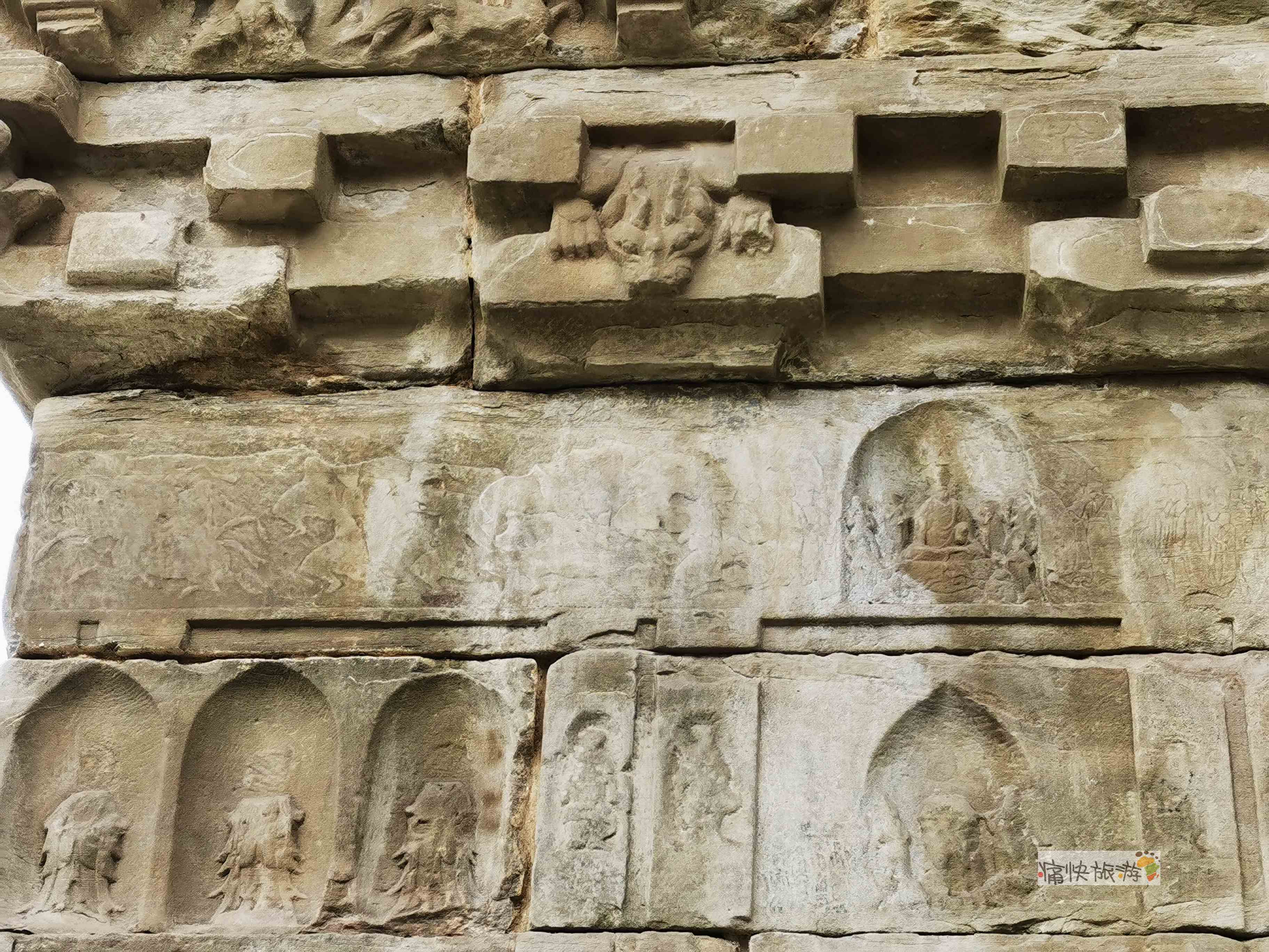 阙体的前后面雕凿佛教造像二十九龛、均为小型龛,每龛高约10厘米,龛内造像少则一尊多者五尊,主要造像为无量佛和观音菩萨造像。