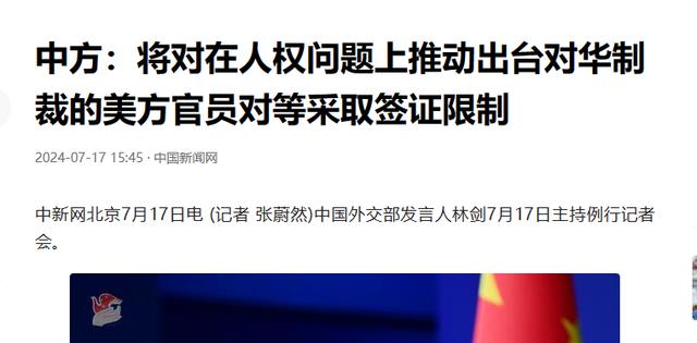 信息来源:《中方:将对在人权问题上推动出台对华制裁的美方官员对等采取签证限制》2024-07-17 中国新闻网