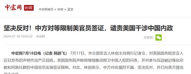 信息来源:《坚决反对!中方对等限制美官员签证,谴责美国干涉中国内政》2024-07-18 中宏网