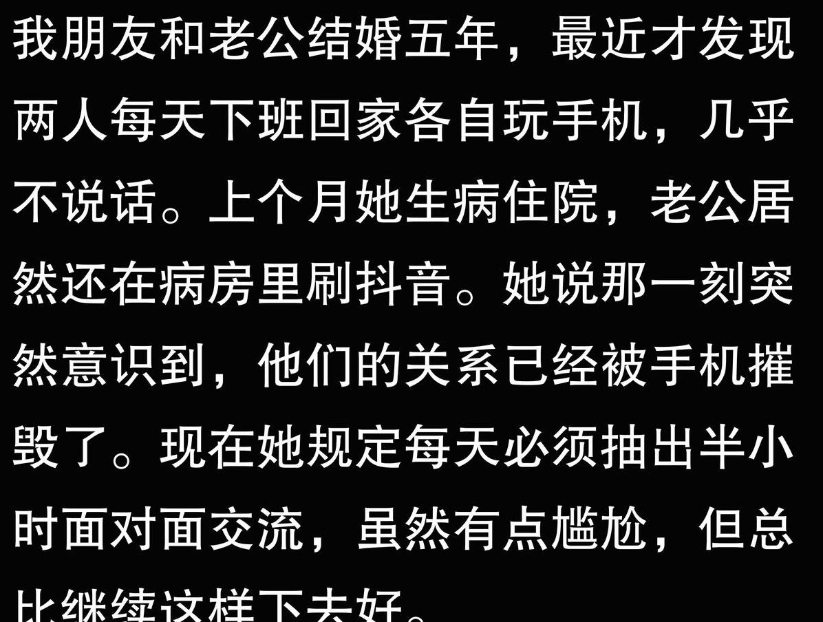 举个简单的例子,有些夫妻习惯在睡前看手机,结果就是各自躺在床上滚屏,几乎没有眼神和言语交流。