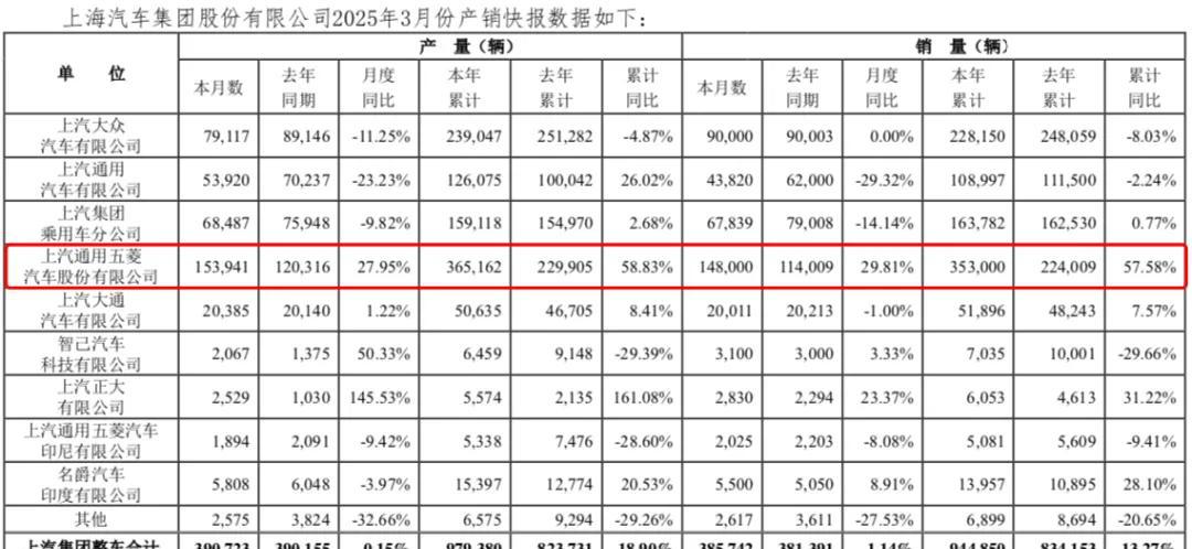 根据上汽集团发布的数据,今年3月,上汽通用五菱的销量达到了14.8万辆,同比增长约30%。1-3月累计销量为35.3万辆,同比增长57.6%。这表明,五菱的市场表现依然强劲。
