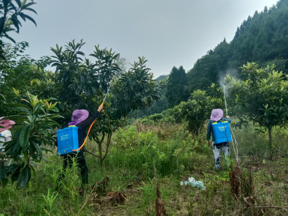 二、果农行动迅速。只见果农们娴熟地在自家枇杷园里疏花疏果:他们采用“一摇二看三定果”方法,摘去多余的次果,剪掉多余的残枝,确保养分能够更专注于核心枝条果实的供给,便于5月份能收获到更饱满美观的优质果实;为确保枇杷树的充足养分,一些果农在院里深翻松土,他们挑担着牛、羊、鸡、鸭粪等农家肥到枇杷园进行着施肥;为有效控制病虫害的滋生和扩散,只见果农们使用低毒且低残留的化学农药进行着喷洒;为保持果园整洁,减少养分竞争,一些果农正在仔细清除着果园里的杂草和落叶;为确保枇杷树有足够的水分供应,一些果农挖沟砌坎,对果园进行着灌溉。