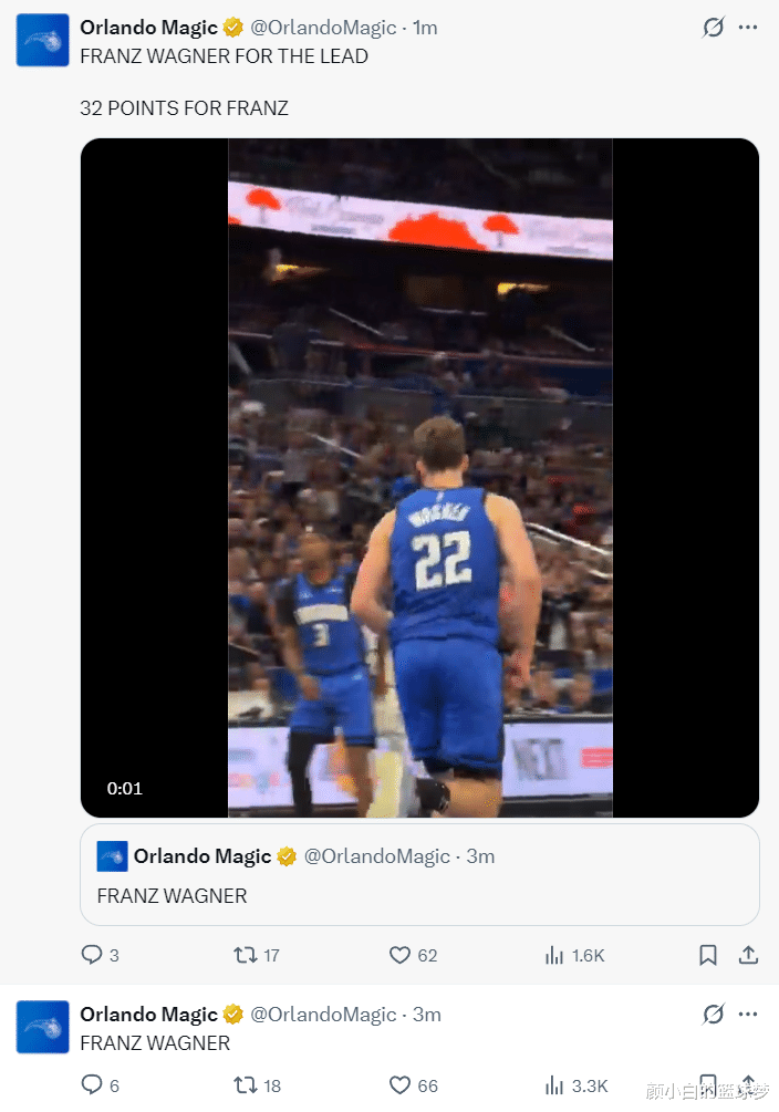 全场比赛小瓦格纳,38分钟,27中11,三分13中3,罚球12中7,拿到32分8助攻7篮板2抢断,命中率40.7%,三分命中率23%。