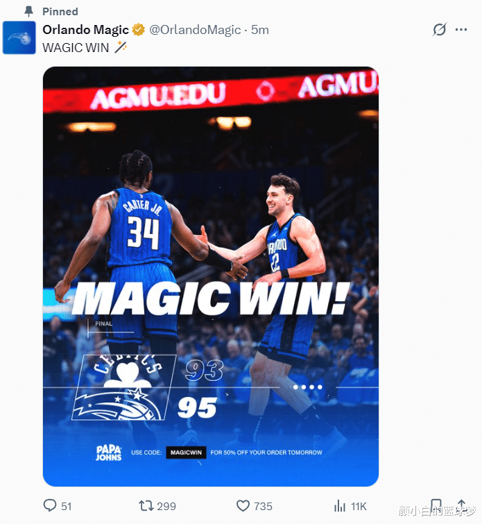 魔术队官方已经高呼小瓦格纳的名字,这是属于季后赛的完美时刻。只可惜随后小瓦两个锁定胜局的三分没中,班凯罗还险些被吹了八秒,好在裁判看了回放是过了半场,塔图姆还触球了。绿凯没有犯规,但小瓦第三个三分没中,51秒-3秒小瓦是4投不中,48秒一波4中0,好在绿凯绝平不中,比赛完结。