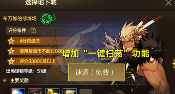 有些人呼吁“布万加”搬砖本,添加“一件扫荡”功能,参考“南部溪谷”、“哥布林金库”、“玻璃树”、“异界陨石”等等,增加“速通”模式即可!