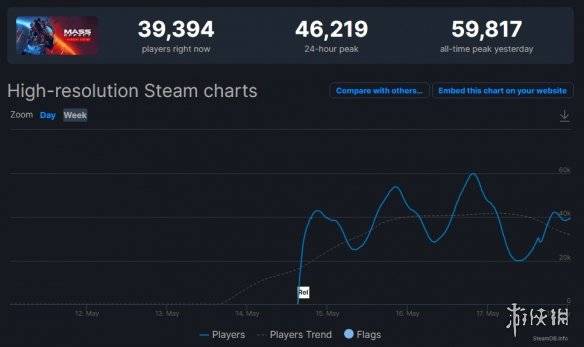 根据SteamDB数据显示,《 质量效应:传奇版》的同时在线玩家人数峰值达到了59817人,目前仍有39394名玩家在线。值得一提的是,虽然直到近几年EA旗下游戏才开始陆续登陆Steam,《质量效应:传奇版》仍取得了不错的成绩,算得上是近年来BioWare迄今为止最成功的Steam游戏,仅次于《Apex英雄》(《Apex英雄》在线玩家峰值为330879人)。
