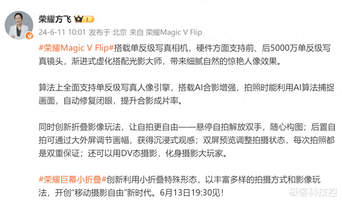 荣耀Magic V Flip,这款即将震撼登场的小折叠手机,将以单反级影像系统和一系列创新功能,重新定义小折叠品类的拍照体验。最近荣耀产品线总裁方飞在微博上的爆料让科技圈沸腾不已。现在让我们以消费者的视角,一探这款荣耀小折的黑科技。