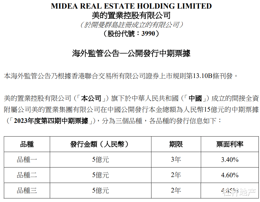 2023年4月,美的置业发行第一期中期票据,总额为12亿元,也是分两个品种,品种一发行金额10亿元,为3年期,票面利率3.52%;品种二发行金额2亿元,2年期,票面利率4.50%。