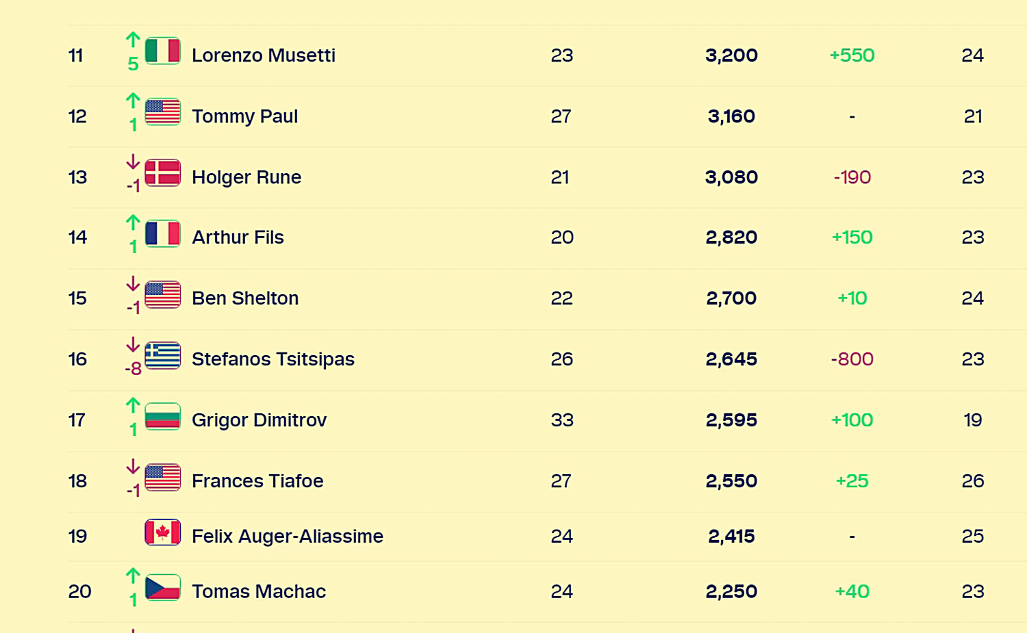希腊一哥西西帕斯因卫冕失利,损失了大把积分,排名下滑8位,跌出TOP15,排在第16位。
