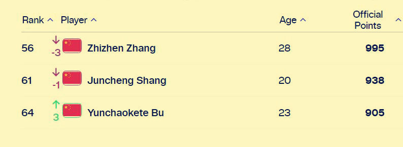 中国球员方面,由于一哥张之臻和二哥商竣程因伤休战,排名略有下滑,张之臻排在第56位,商竣程是第61位。而三哥布云朝克特则排在第64位,距离商竣程的分差只有33分。另外,有最新消息,称张之臻、商竣程都已经官宣因伤退出马德里大师赛了,小布同学如果能抓住机会,有望在近期实现在排名上的超越。