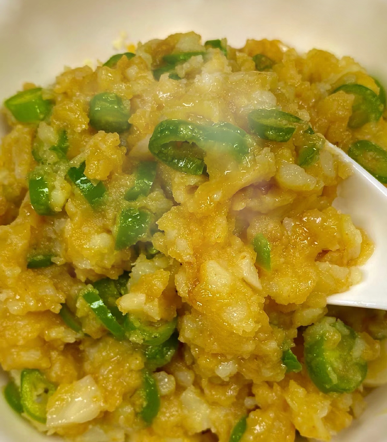 5. 加入土豆泥:倒入土豆泥翻炒,让青椒的清新与土豆泥的醇厚相互渗透。