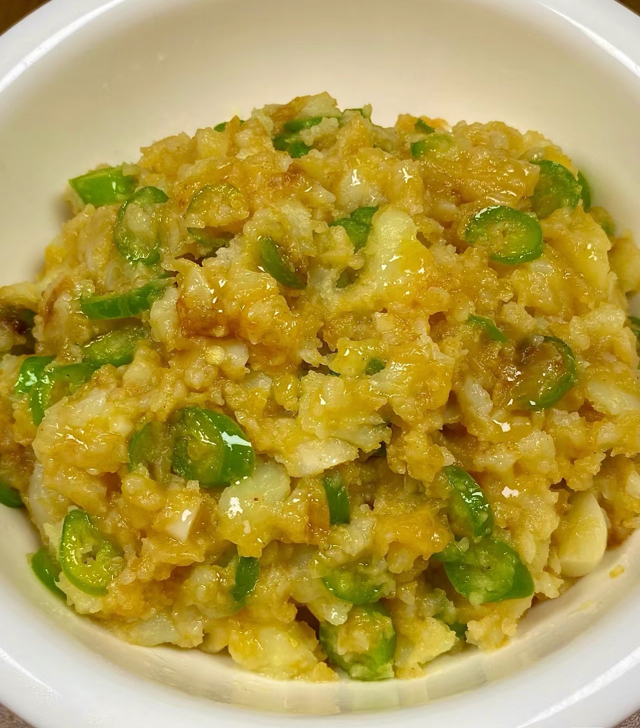 7. 出锅装盘:将做好的青椒土豆泥盛出,也可以根据喜好撒上一些切碎的新鲜香草作为装饰。