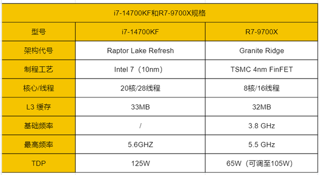 显而易见,两者基本上不相上下。单论核心参数,i7-14700KF表现稍微强势一点,还有更高睿频优势。而锐龙 7 9700X则采用了更先进的制造工艺,拥有更低的TDP功耗,这是它的一大优势所在。