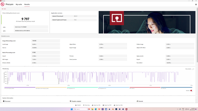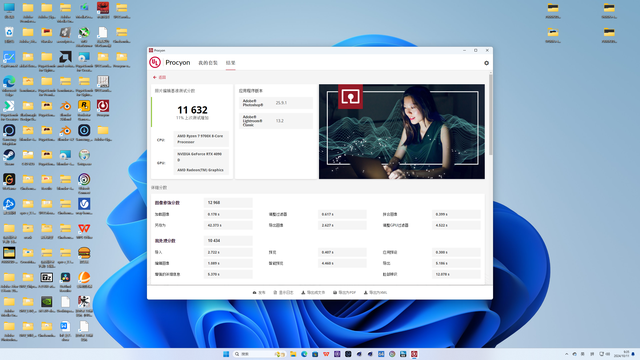 再来看生产力表现,对于PS等内容创作者而言,处理器的多核性能至关重要。鉴于锐龙7 9700X在核心数量上并未发生变化,多核性能进步有限,难以和Intel的异构架构相抗衡。实测中,酷睿i7-14700KF凭借其更高的核心数量和强大多线程处理能力,在视频渲染、3D建模等生产力任务中更胜一筹。