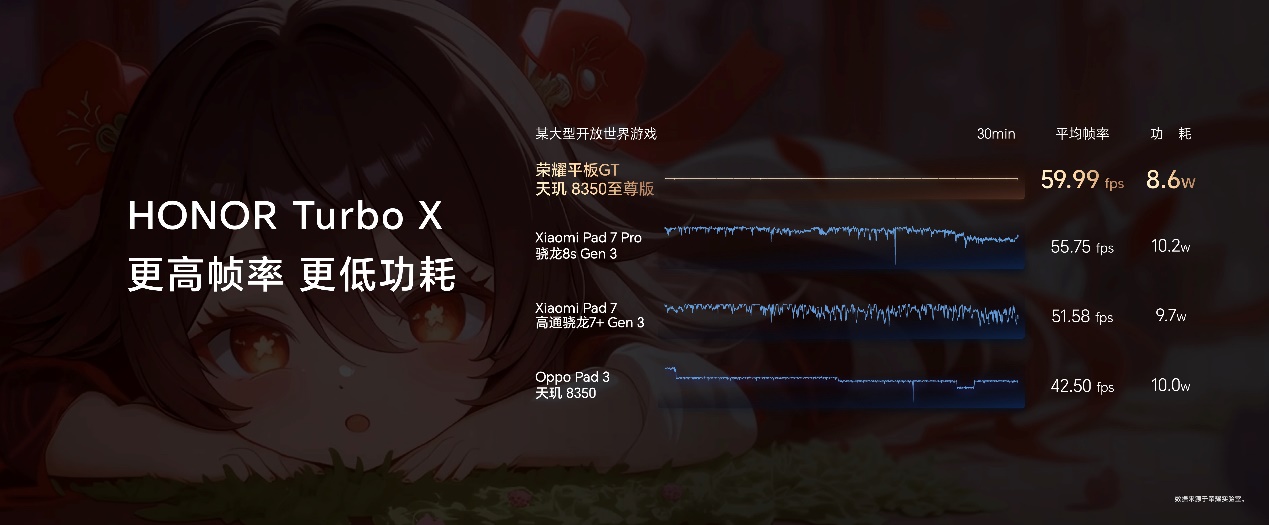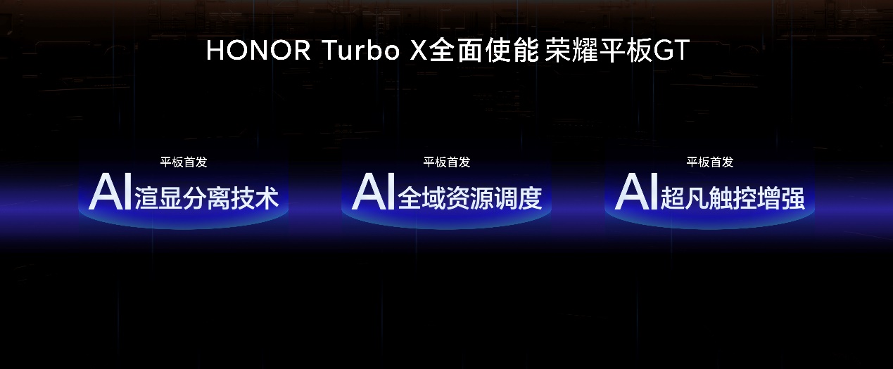 在档位最强芯片的基础上,荣耀平板GT搭载HONOR Turbo X调校技术,首发AI渲显分离、AI全域资源调度、AI超凡触控增强三大技术,助力打造极致的游戏体验。