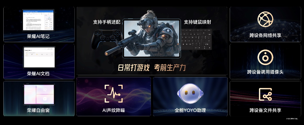此外,荣耀平板GT还具备AI声纹降噪、全能YOYO助理、跨设备网络共享、跨设备调用摄像头、跨设备文件共享等功能,无论是移动办公还是在线学习,荣耀平板都是能给用户带来惊喜的AI生产力搭档。