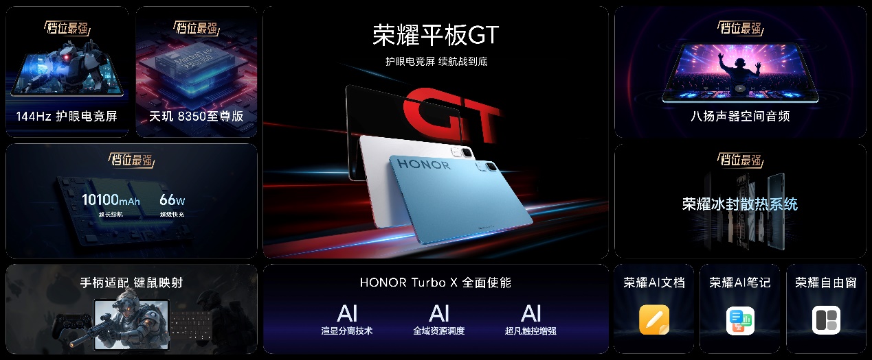 2025年4月23日,荣耀发布了全新平板产品——荣耀平板GT,作为同档位平板的标杆之作,荣耀平板GT搭载144Hz旗舰电竞屏、10100mAh超长续航、HONOR Turbo X调校等一系列软硬件配置,成为广大玩家的游戏新选择。荣耀平板GT于发布会后开启首销,国补后1444.15元起。
